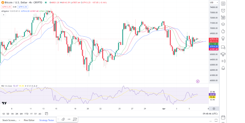 Looking at the overall trend, the mixed alignment of the Alligator indicator lines suggests a lack of a clear trend in the near term. As of press time, the Bitcoin price stood at $67,825, representing a minor 1.5% pump from its previous 24-hour price.