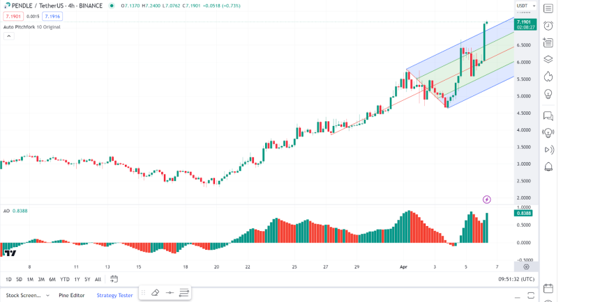 On the other hand, the green bars on the Awesome Oscillator (AO) indicate increasing bullish momentum. The Pitchfork channels show a clear uptrend, with the price staying mostly within the upper half of the Pitchfork. As of press time, the Pendle price stood at $7.19, representing a 22.7% increase from its previous 24-hour price.