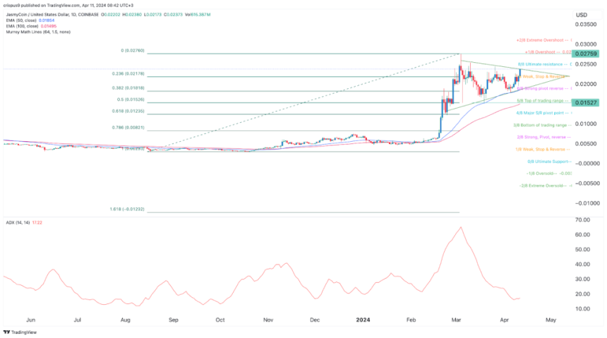 Most importantly, JasmyCoin price is approaching the Ultimate Resistance of the Murrey Math Lines tool. It has also soared above the upper side of the symmetrical triangle.