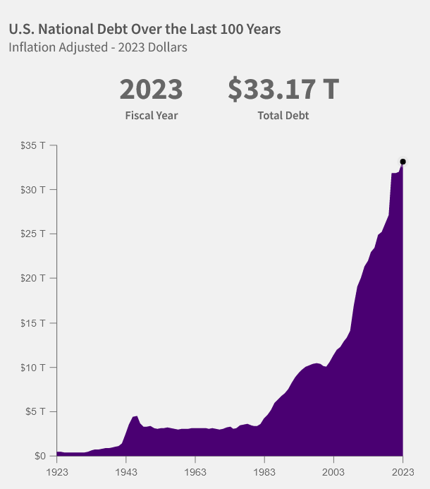 The U.S. national debt continued its exponential rise in 2022 and 2023, increasing 4.35% to $33.2 trillion over those two fiscal years, according to data from the U.S. Treasury.