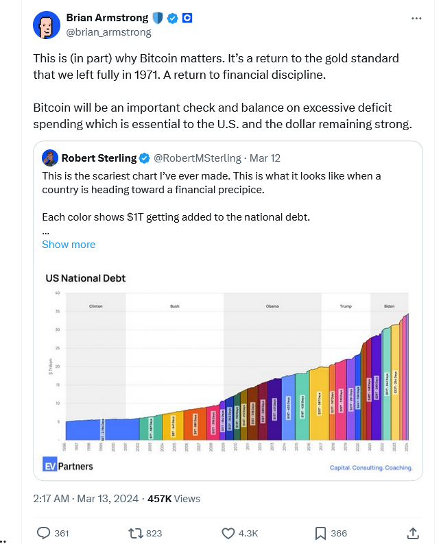 Coinbase CEO Brian Armstrong recently voiced that increased Bitcoin (BTC) adoption in the U.S. could serve as a “check and balance on excessive deficit spending,” which he believes is essential for the U.S. dollar to remain strong.
