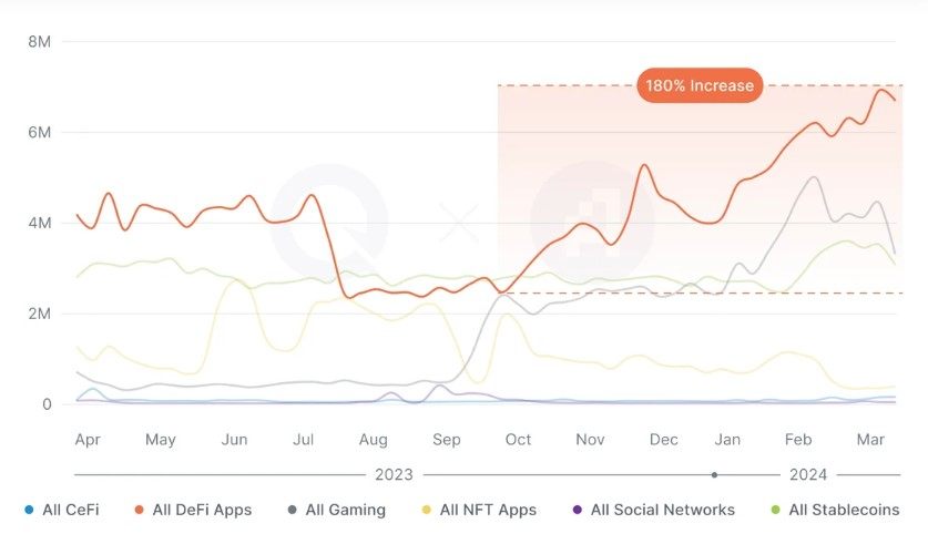 In a recent report published by QuickNode, the first quarter of 2024 showed the dominance of decentralized finance (DeFi) and the notable growth of Web3 gaming in the crypto industry, which outperformed the stablecoin sector in key metrics, indicating investor preference and market sentiment during this period.