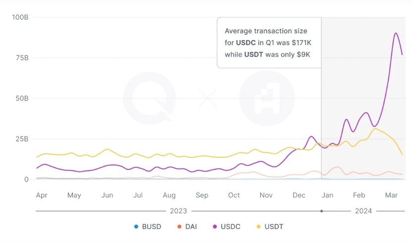 Tether‘s USDT remains the dominant stablecoin, controlling approximately 75% of the market cap. Notably, Circle’s USDC has taken the lead in volume and average transaction size, partly due to Coinbases efforts to integrate USDC on its platform and promote its use on its Layer 2 network, Base.
