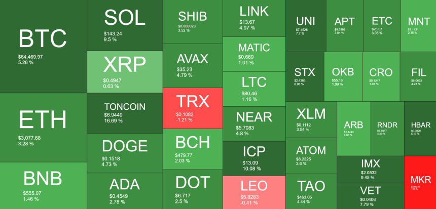 Although BTC is now below $65,000, it is still up by 5% in the past day. Its market cap has neared $1.3 trillion, and its dominance over the alts is at 51.7%.