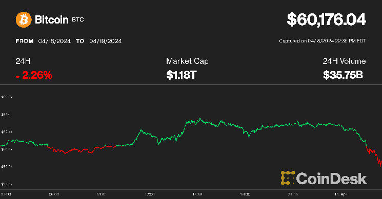 (BTC) fell 5%, dipping below $60,000 before quickly recovering to about that level, as Israel hit back against Iran for a missile strike last week.