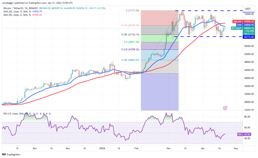If the price turns down sharply from the moving averages, it will signal that bears are selling on rallies. That could result in a retest of the $60,775 to $59,600 support zone. Buyers are expected to defend this zone with all their might because a breakdown could accelerate selling. The BTC/USDT pair may then plummet to the 61.8% Fibonacci retracement level of $54,298.