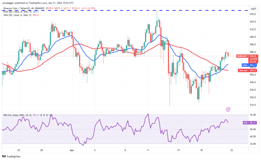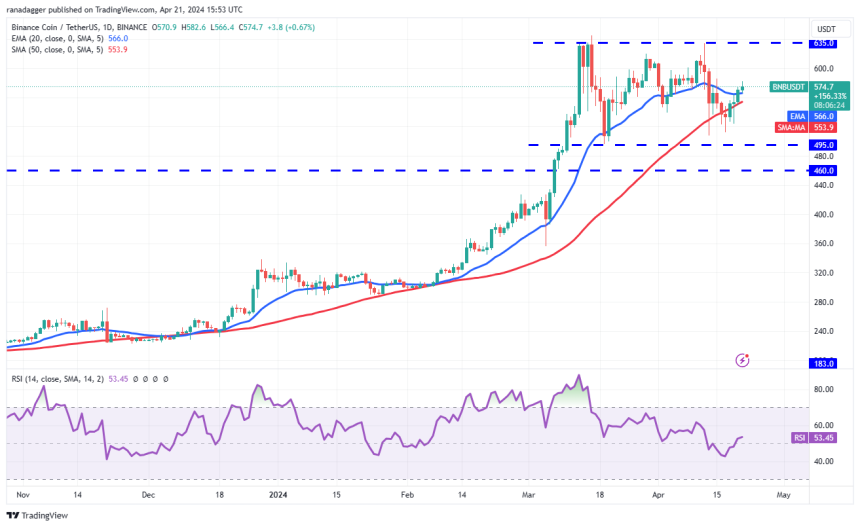 Buyers pushed the price above the moving averages on April 20, indicating that the selling pressure is reducing. The BNB/USDT pair could move toward the overhead resistance of $635, where the bears are likely to sell aggressively. If the price turns down sharply from $635, the range-bound action may continue for a while longer.