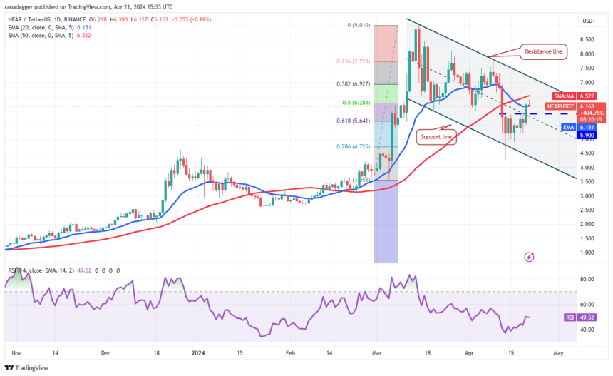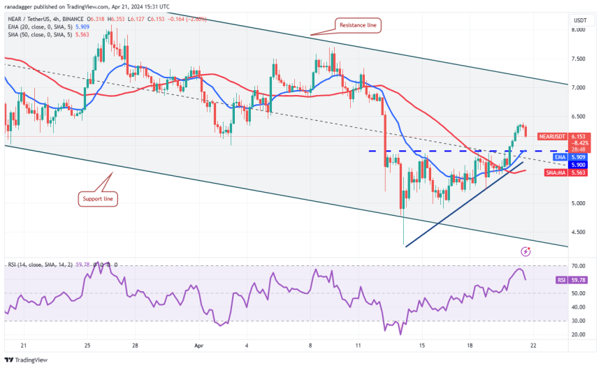 However, the rise above the 20-day EMA ($6.15) suggests that the selling pressure may be reducing in the short term. The NEAR/USDT pair will attempt a rally to the resistance line, where the bears are likely to sell aggressively. If the price turns down sharply from the resistance line, it will signal that the pair may remain inside the channel.