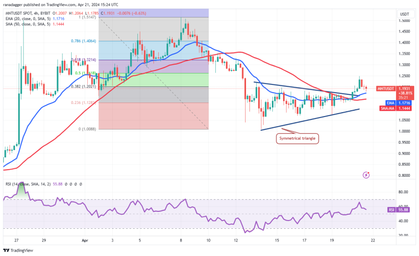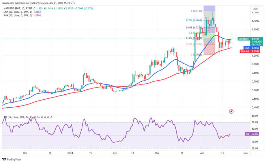 However, the long wick on the April 21 candlestick shows that the bears have not yet given up and are attempting to pull the price back below the 20-day EMA. If they do that, it may trap the aggressive bulls and yank the price down to the 50-day SMA ($1.09). A break below this level could sink the MNT/USDT pair to $1.