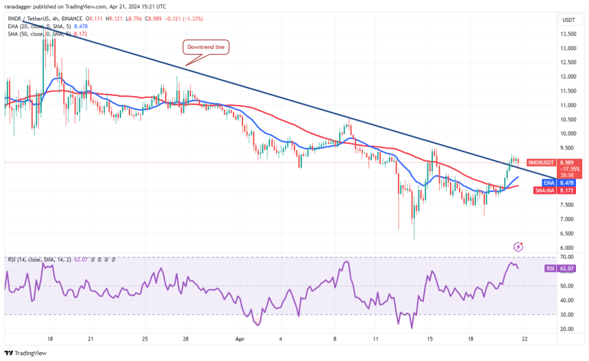 The 20-day EMA ($8.90) has flattened out, and the RSI has risen to the midpoint, suggesting that the bears are losing their grip. If the price maintains above the 20-day EMA, the RNDR/USDT pair is likely to rise to the 50-day SMA ($9.95) and then to $12.