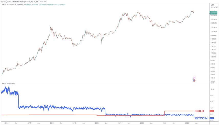 Bitcoin‘s fourth halving resulted in a 50% drop in the digital asset’s supply growth rate, surpassing gold in terms of inflation rate.