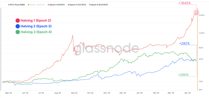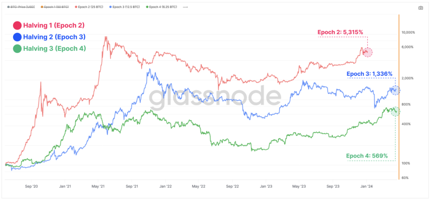 However, Glassnode cautioned its readers to manage their expectations against historical precedents, arguing that the performance of Bitcoin across various halving epochs is “very widespread” and “too different” to be used as a guide today.