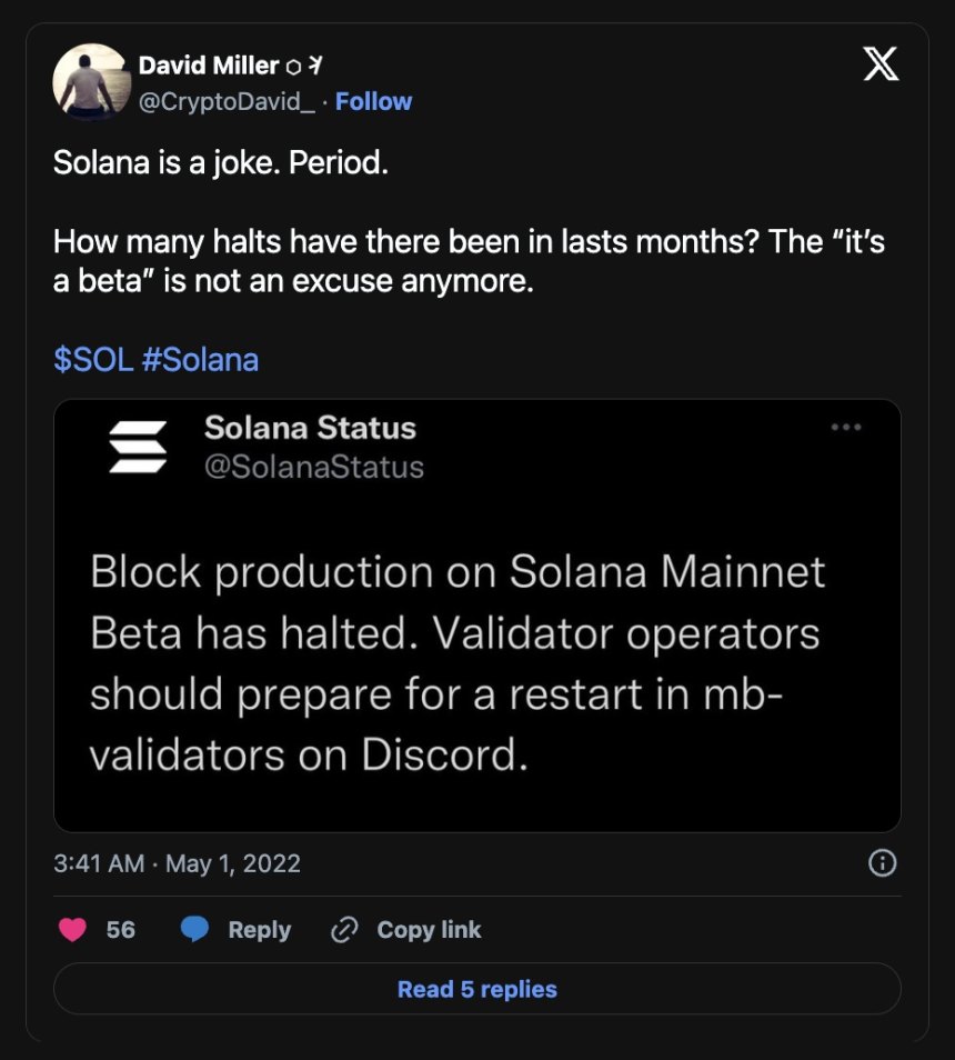 Users have been getting upset about Solana's outages for years. Source: X