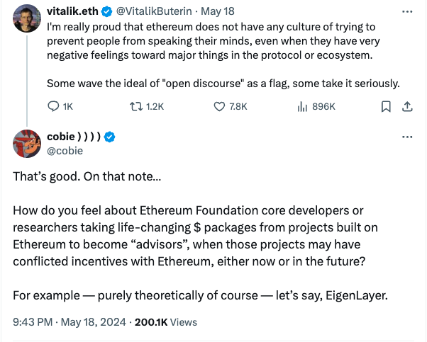 A day earlier, crypto trader and UpOnly co-host Jordan Fish, who goes by Cobie, asked Ethereum co-founder Vitalik Buterin his thoughts on Ethereum Foundation staff “taking life-changing [monetary] packages” from projects that “may have conflicted incentives with Ethereum” — giving EigenLayer as a theoretical example.