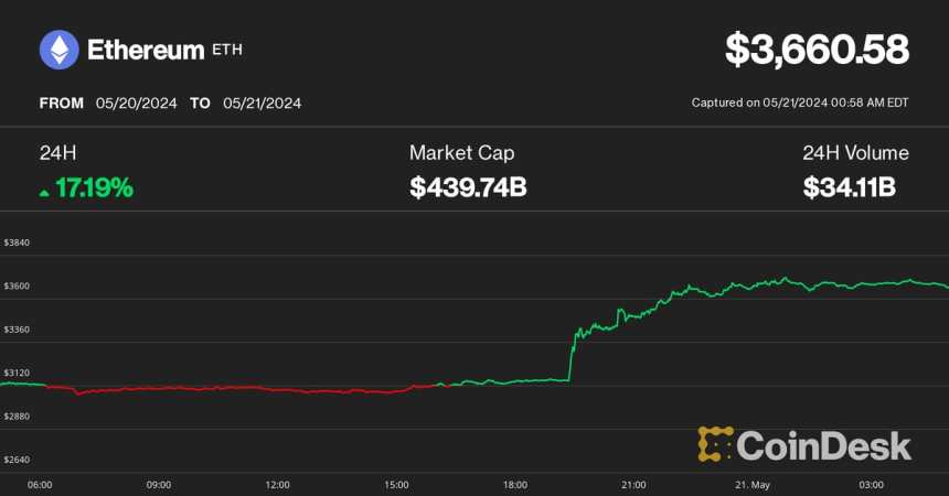 Ether (ETH) surged 17% to over $3,600 as favorable regulatory developments increased the likelihood of ETF approval.