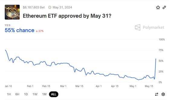 A Polymarket contract asking if an ether ETF would be approved by May 31 jumped from 10 cents to 55 cents, representing a 55% chance that approval will take place by May 31.