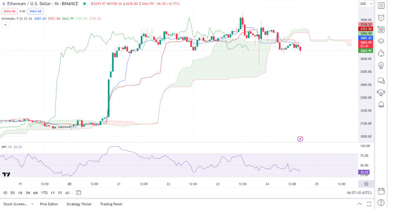 Despite the approval of Ethereum ETFs, Ethereum‘s price movements show that it is still facing bear actions in today’s session. An in-depth analysis shows that the Ethereum price is currently under the Ichimoku Cloud, indicating a bearish outlook in the short term. A move above the Cloud could suggest a bullish reversal.