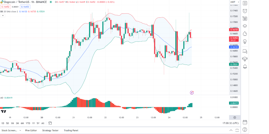 On the other hand, the Awesome Oscillator shows a green bar, indicating a bullish momentum as the price rebounded. As of press time, the Dogecoin price stood at $0.1644, a 2.19% increase in valuation over the last 24 hours.