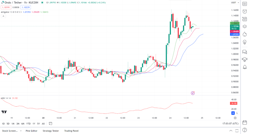 On the other hand, the Average Directional Index (ADX) is 31.92, which signifies a moderately strong trend, though the lack of clear direction from the Alligator suggests cautious trading. As of press time, the ONDO price stood at $1.10, a 14.05% increase in valuation over the last 24 hours.