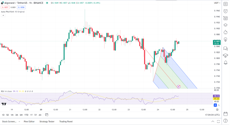 Algorand (ALGO) is also among the gainers in todays session, as seen from its price movements. An in-depth analysis shows that the Algorand price is trading within the upper half of the pitchfork, indicating a bullish bias. However, resistance appears as the price approaches the upper boundary.