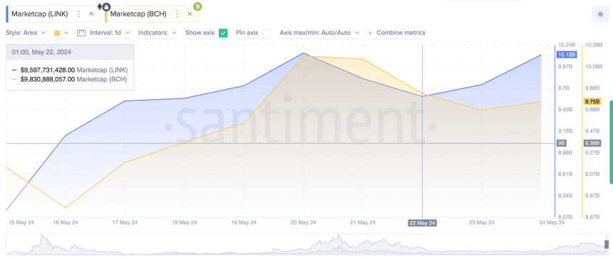 The chart below shows the changes in market capitalization of Chainlink in comparison to Bitcoin Cash since the Ethereum ETF approval.