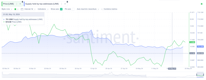 Chainlinks top 100 investors held a cummulative balance of 701.05 million LINK tokens at the start of the week on May 19. But as indicated by the blue trendline in the chart above the whale investors have rapidly acquired over 1.2 million LINK, to bring their balances to 702.25 million at the time of publication on May 25.