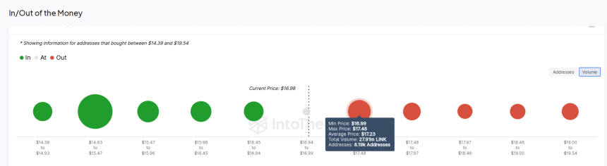 Looking at the historical accumulation trends, Chainlink price now faces a major resistance around the $17.50 level where, 8,190 active addresses had acquired 27.9 million LINK tokens.