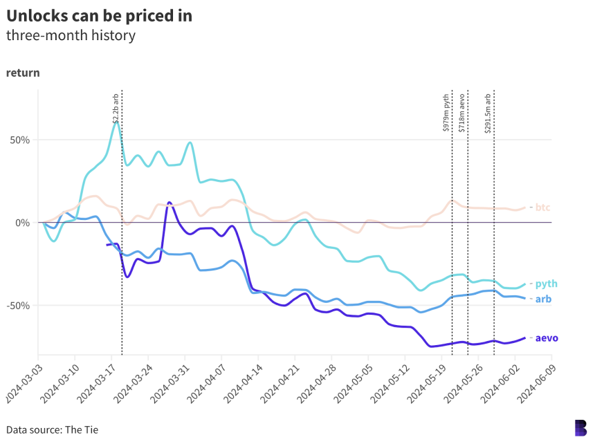 In those cases, bad vibes around the impending token unlocks — in arbitrums case worth $2.2 billion — appear to have dragged prices down well before the actual supply was released.