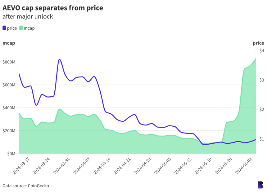 In aevo‘s case, its market cap immediately quadrupled thanks to a huge unlock last month. The same can’t be said for its price