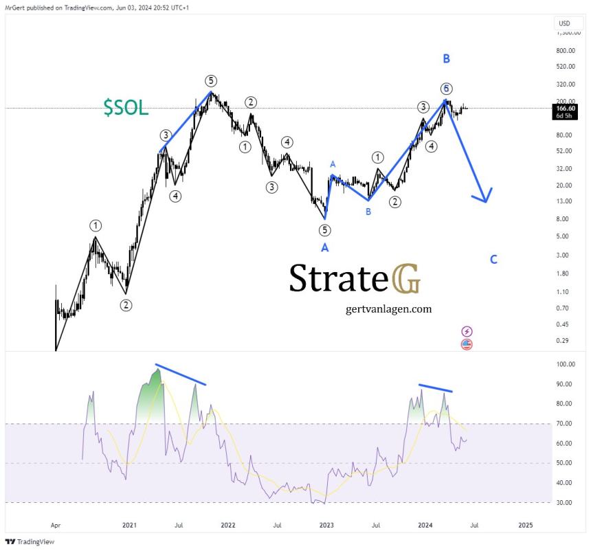 Van Lagen posted via X: “Im short on SOL –> ready for the next leg down. 2021: Finalized a clean Elliottwave up; 2022: A-wave down of prolonged bear market <- 5 subwaves; 2023: B-wave of prolonged bear market <- 3 subwaves; 2024: Expectation is C-wave down. Bearish divergence on the weekly RSI.”