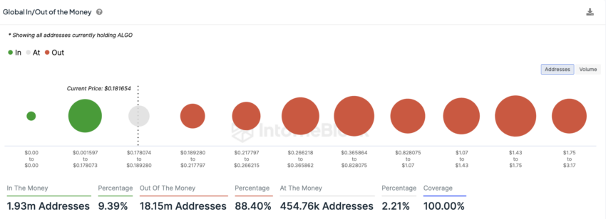 Algorand (ALGO) stands out with peculiar statistics. Data from IntoTheBlock indicates that only 9.39% of ALGO holders are currently in profit.