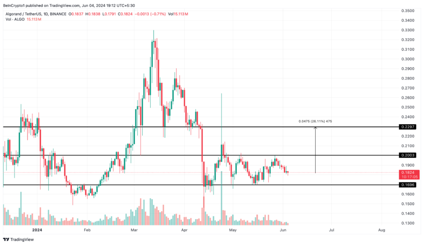From a technical analysis perspective, ALGO has been trading between $0.200 and $0.169 since April 26. Analysts predict a breakout above the $0.200 mark could lead to a 26% price surge, targeting $0.229.