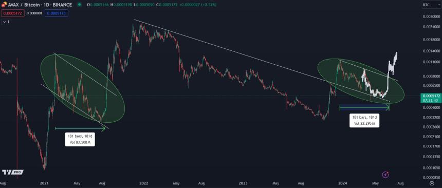Pseudonymous trader Kaleo tells his 641,800 followers on the social media platform X that Avalanche (AVAX) may be about to mirror a 2021 bullish pattern against Bitcoin (BTC).