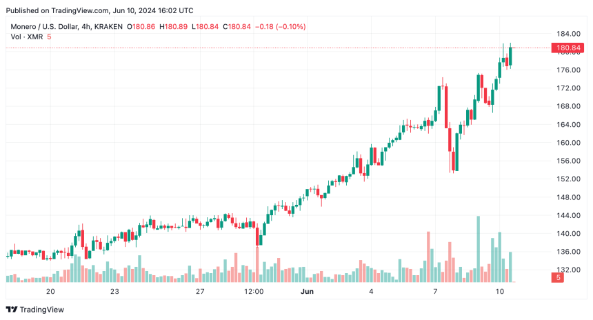 XMR charts show a strong bullish trend across various timeframes. The daily chart indicates a significant upward movement from mid-May, with prices rising from approximately $130 to the current $181.