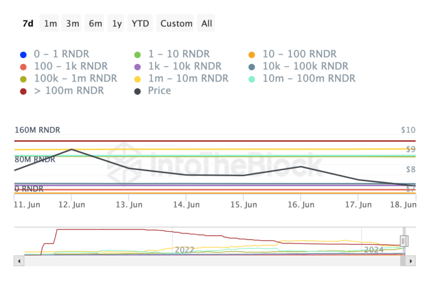 According to IntoTheBlock, RNDR whales have been distributing the token. Data from the blockchain analytic platform reveals that addresses holding 1 million to 100 million RNDR have decreased their balance in the last seven days.