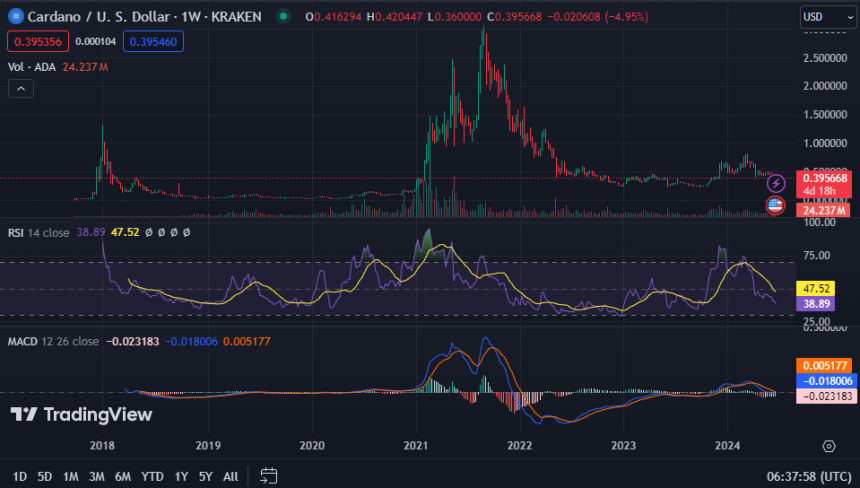 Cardanos 1-day RSI reads 38.82, approaching oversold conditions, which could indicate a buying opportunity. However, the 1-day MACD trading below the signal line suggests bearish momentum in the short term.