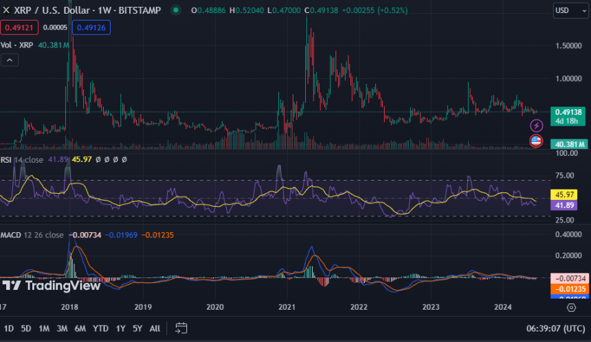 At the time of writing, XRP is trading at $0.4916 with a marginal decline of 0.36%. The price has been moving sideways with occasional upward and downward momentum. The 24-hour trading volume is lower by 38.52%, amounting to $1,546,642,257 with Volume/Market ratio of 5.66%. The nearest support is $0.485 and resistance at $0.495.