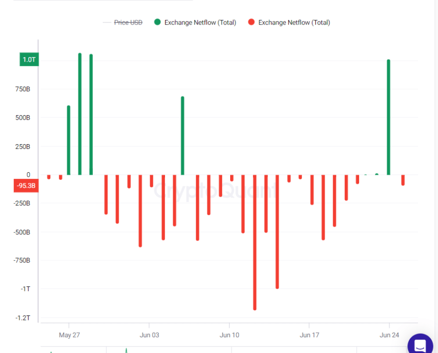 According to on-chain data from CryptoQuant, crypto exchanges had received approximately 196 billion SHIB tokens at press time. This figure contrasts with the 2.3 trillion SHIB tokens deposited to exchanges yesterday, June 24.