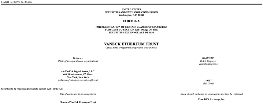 VanEck files an 8-A form for Ethereum ETF after Bitcoin ETF.