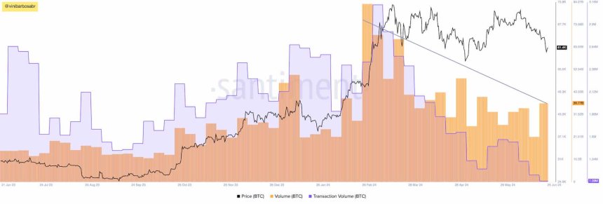 According to data gathered from Santiments SanBase Pro on June 25, the scenario remains the same by press time. BTC trades in a price range, currently at $61,400, while trading and transaction volumes make lower highs.