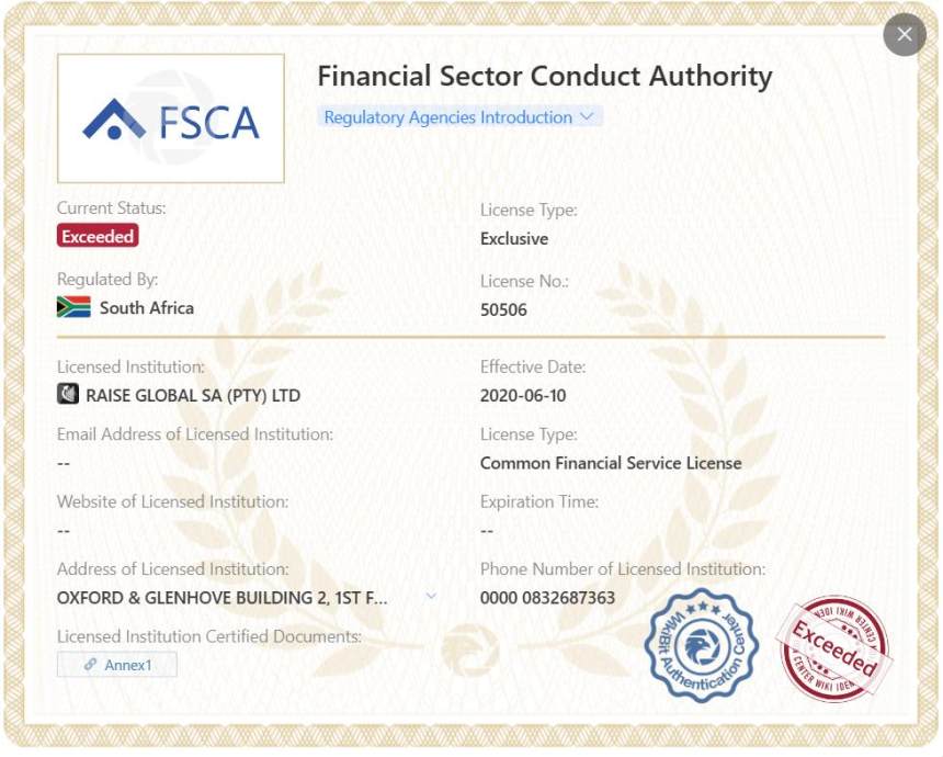 RaiseFX is regulated by the Financial Sector Conduct Authority (FSCA) (No.50506) . However, it is worth noting that their license has exceeded the specified timeframe. This indicates that the license granted to RaiseFX may no longer be valid or in compliance with regulatory requirements.
