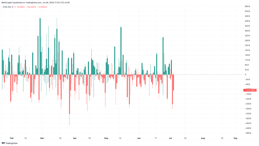 As of this writing, the Cumulative Volume Delta (CVD) shows otherwise. The CVD shows the difference between buying and selling volume in the market.
