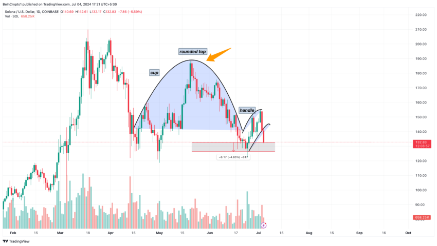 The inverted cup and handle signal a bearish continuation. Based on the formation of this pattern, the price of SOL may face a 4.65% decline, which would take it to $126.94.