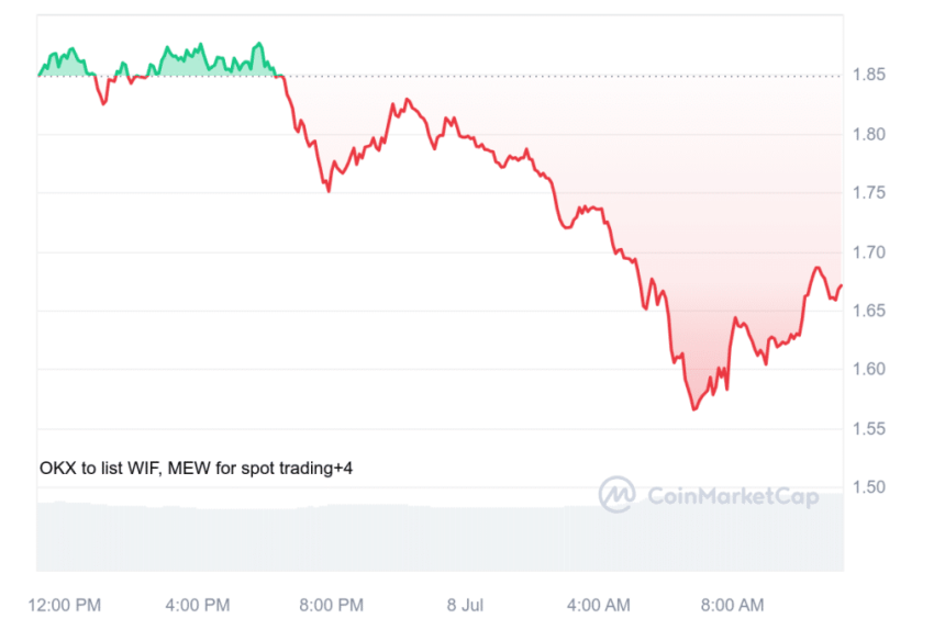 Meanwhile, Solana-based meme coin WIF was still down 11% over the last day, exchanging hands at $1.66 at the time of publication. Over the past week, the token also precipitated under 27%. Meanwhile, the dog-themed meme coin wearing a knitted pink hat has experienced a 14% rise in its daily trading volume, hovering around $468 million. Its market cap had fallen to $1.6 billion.
