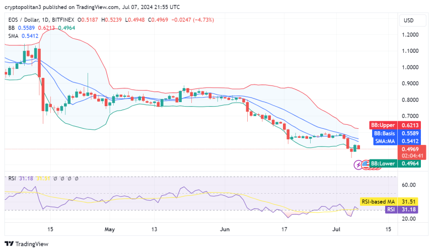 The daily as well as the hourly EOS price analysis for July 7, 2024, confirms a strong downtrend for the cryptocurrency. Although the buying pressure remained higher as compared to the selling pressure yesterday, today the bears have taken over. The selling activity is intensifying once again as the red candlestick confirms the decreasing momentum. Overall, the coin value has deteriorated to $0.4969, considering the rapid bearish turn in the last 24 hours.