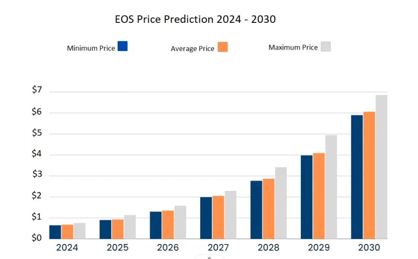 EOS could reach a maximum price of $6.86 in 2030. Traders can expect a minimum price of $5.90 and an average forecast price of $6.06.