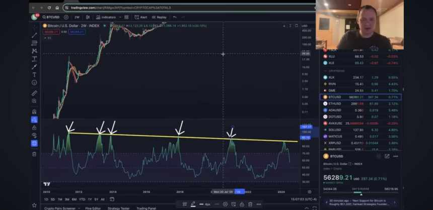 Looking at two-week candles, Cowen notes that every single one of Bitcoins price tops coincided with the RSI hitting the same downward resistance level – something that has already happened in March.