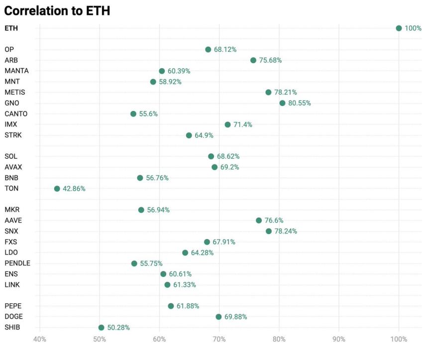 Hartvigsen‘s analysis titled “ETH Beta – a Recipe for Disaster?” provides an analysis of whether buying ETH-correlated altcoins, commonly referred to as ’ETH betas,‘ constitutes a good investment strategy. These assets, including tokens like OP, ARB, MANTA, MNT, METIS, GNO, CANTO, IMX, STRK (all L2’s), MKR, AAVE, SNX, FXS, LDO, PENDLE, ENS, LINK (all DeFi) PEPE, DOGE (all memes), SOL, AVAX, BNB and TON (alternative L1‘s) are traditionally viewed as offering leveraged exposure to movements in Ethereum’s price, assuming a higher volatility relative to Ethereum itself.