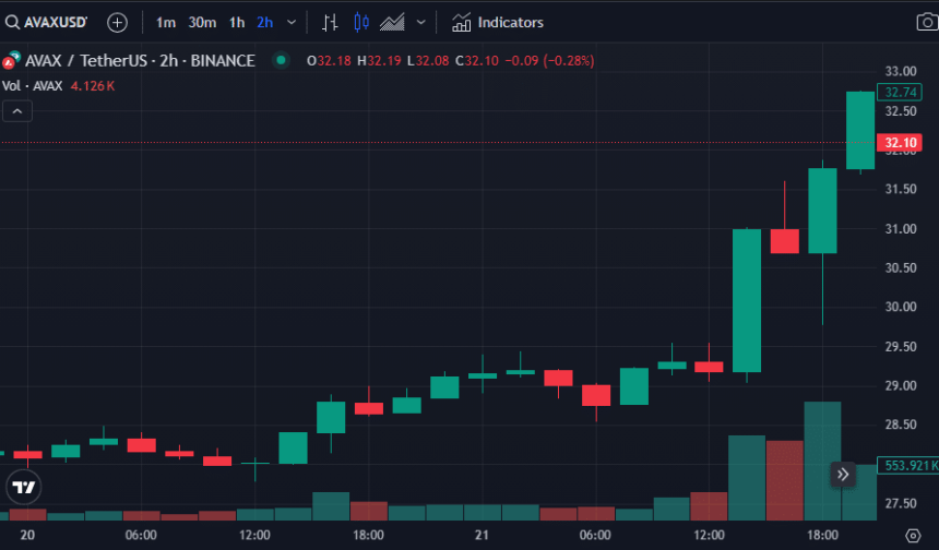 AVAX, the native token of Layer-1 blockchain Avalanche, has experienced a notable increase of 13% over the last 24 hours, positioning it as the top gainer among the top 100 cryptocurrencies by market capitalization.