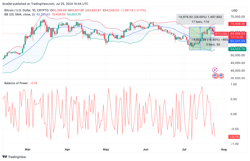 Currently, BTC is trading near $64,008, with the Bollinger Bands showing resistance at $70,409 and support at $54,053. The Parabolic SAR indicates a potential downward trend, while the Balance of Power is at -0.76, reinforcing the bearish sentiment.